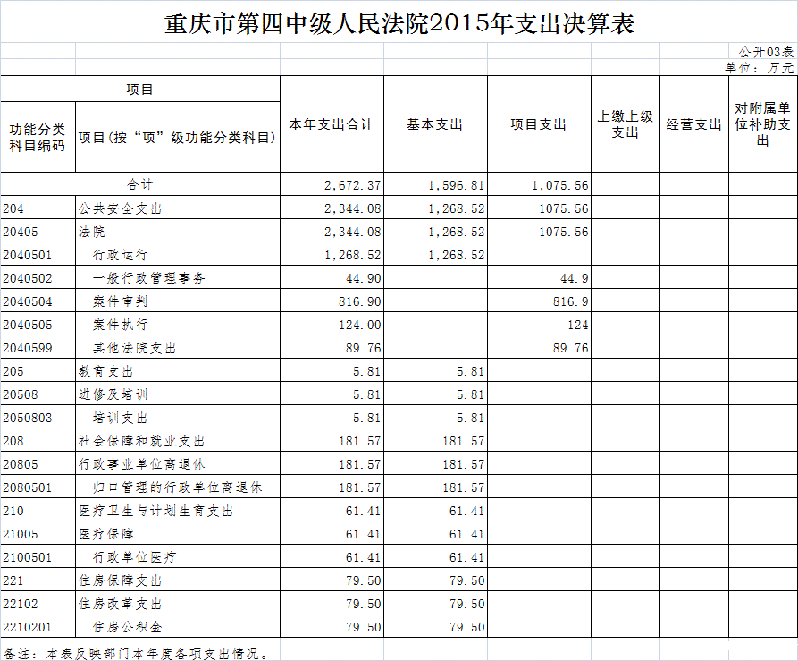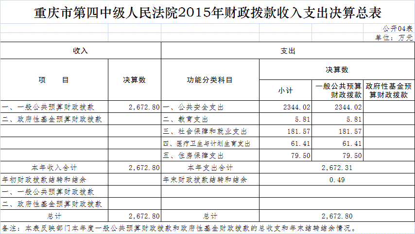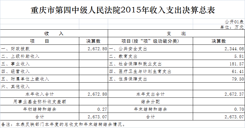(一)2015年部门决算本年收入2672.8万元,比上年决算数增加6.2万元,比年初预算数增加516.91万元,主要原因为:上年指标结转51.05万元;追加中央政法保障经费177万元(年初已安排上年标准的70%);2014年诉讼费统筹分配资金81万元;在职及退休职工调资78.53万元;目标考核奖89.25万元;医保公积金等年终清算40.08万元。2015年部门决算本年支出2672.37万元,比上年决算数增加5.37万元,比年初预算数增加516.48万元 。2015年年末结转0.70万元。