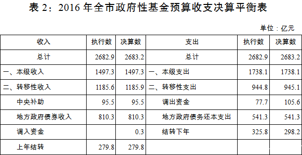 政府性基金预算。2016年,全市政府性基金预算收入1497.3亿元,下降8.9%,为预算的99.8%,加上中央补助、地方政府债券、上年结转等,收入总计2683.2亿元。全市政府性基金预算支出1738.1亿元,增长0.4%,为预算的83.5%,加上地方政府债务还本、调出资金和结转下年等,支出总计2683.2亿元。