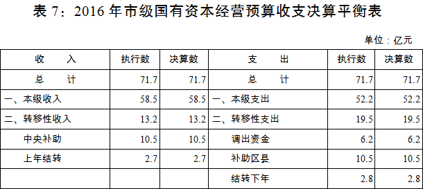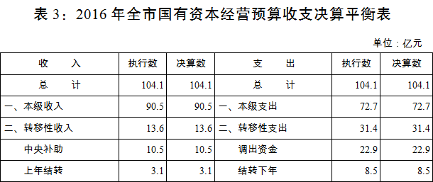 国有资本经营预算。2016年,全市国有资本经营预算收入90.5亿元,下降0.1%,为预算的158.8%,加上中央补助和上年结转等,收入总计104.1亿元。全市国有资本经营预算支出72.7亿元,下降2.9%,为预算的125.3%,加上结转下年和调出资金等,支出总计104.1亿元。与2016年执行数相比,全市国有资本经营预算收支决算数总计无变动。