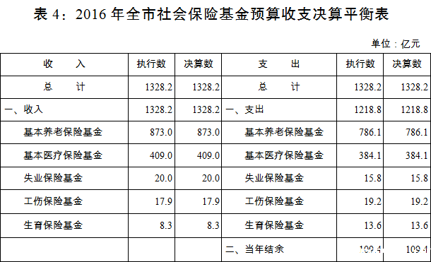 社会保险基金预算。2016年,全市社会保险基金预算收入总计1328.2亿元,增长7.6%,为预算的92.4%。其中:基本养老保险基金收入873亿元,基本医疗保险基金收入409亿元,失业保险基金收入20亿元,工伤保险基金收入17.9亿元,生育保险基金收入8.3亿元。全市社会保险基金预算支出1218.8亿元,增长10.7%,为预算的88.5%。其中:基本养老保险基金支出786.1亿元,基本医疗保险基金支出384.1亿元,失业保险基金支出15.8亿元,工伤保险基金支出19.2亿元,生育保险基金支出13.6亿元。当年结余109.4亿元。与2016年执行数相比,全市社会保险基金预算收支决算数总计无变动。