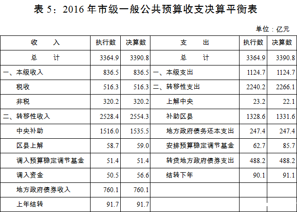 一般公共预算。2016年,全市一般公共预算收入2227.9亿元,同口径增长7.1%,为预算的97.8%,加上中央补助、地方政府债券、上年结转、调入资金和调入预算稳定调节基金等,收入总计5030.2亿元。全市一般公共预算支出4001.8亿元,增长4.9%,为预算的92.7%,加上地方政府债务还本、上解中央、补充预算稳定调节基金和结转下年等,支出总计5030.2亿元。