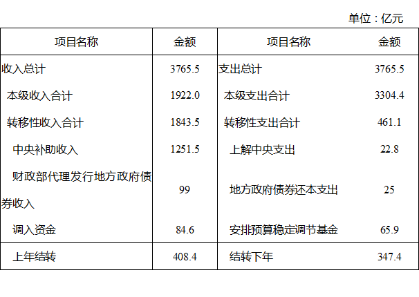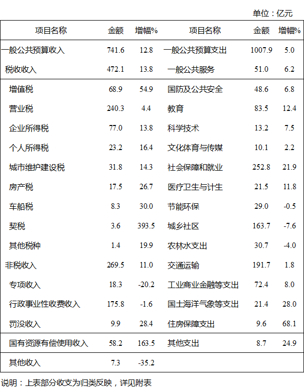 一般公共预算。2014年全市一般公共预算收入1922亿元,增长13.9%,为预算的105.1%,加上中央补助、地方政府债券和上年结转等,收入总计3765.5亿元。全市一般公共预算支出3304.4亿元,增长8%,为预算的94.4%,加上地方政府债券还本、上解中央、安排预算稳定调节基金和结转下年等,支出总计3765.5亿元。(见表1、表2)