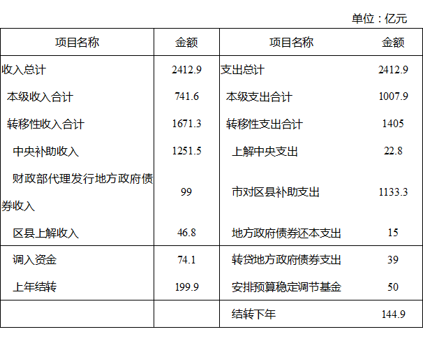 2014年市本级一般公共预算收入741.6亿元,增长12.8%,为预算的105.8%,加上中央补助、地方政府债券、区县上解、上年结转和调入资金等,收入总计2412.9亿元。市本级一般公共预算支出1007.9亿元,增长5%,为预算的92.9%,加上市对区县补助、上解中央、转贷地方政府债券、归还地方政府债券、安排预算稳定调节基金和结转下年等,支出总计2412.9亿元。(见表5、表6)
