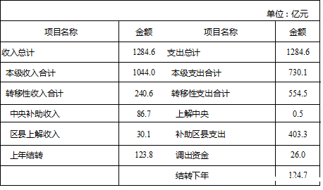 市本级政府性基金收入1044亿元,增长0.5%,为预算的102.7%,加上中央补助、上年结转、区县上解等,收入总计1284.6亿元。市本级政府性基金支出730.1亿元,减少22.7%,为预算的82.6%,加上市对区县补助、上解中央、结转下年和调出资金等,支出总计1284.6亿元。(见表7)